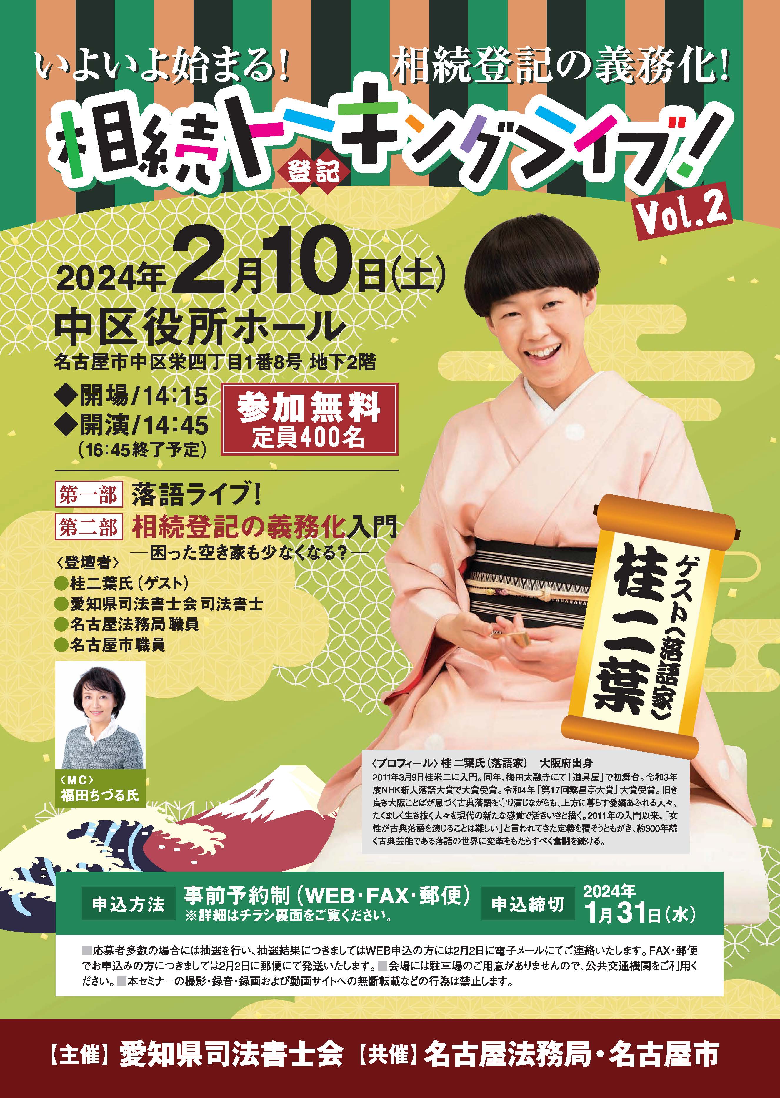 ゲストには、バラエティ番組やワイドショーなどでもご活躍の落語家の桂二葉さんを迎え、上方の古典落語をお楽しみいただいたあと、桂二葉さんといっしょに相続トーキ(登記)ングします。