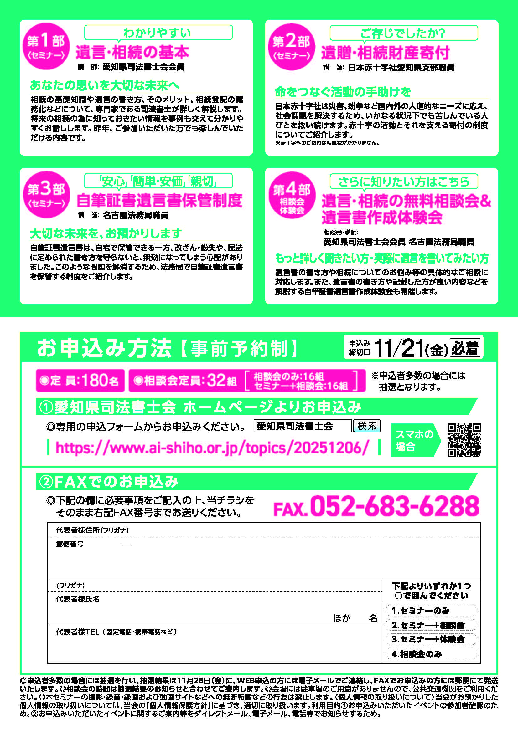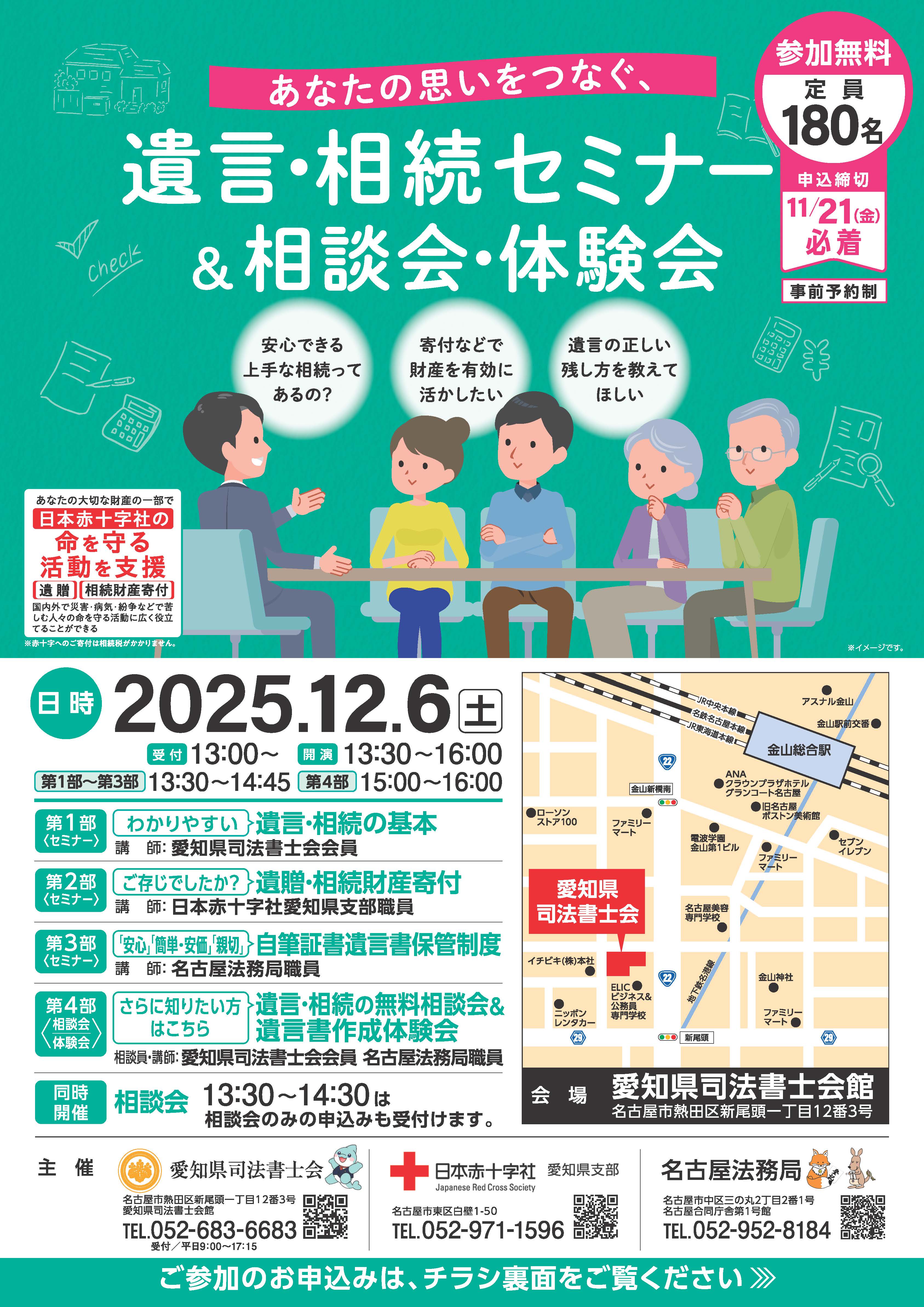 愛知県司法書士会では、日本赤十字社愛知県支部及び名古屋法務局と共催で「あなたの思いをつなぐ、遺言・相続セミナー&相談会・体験会」を開催します。セミナーの後は、司法書士による個別相談会及び司法書士・法務局職員による遺言書作成体験会を開催します。