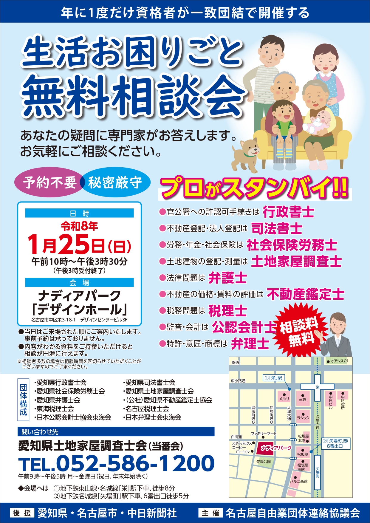 令和8年1月25日(日) 名古屋自由業団体連絡協議会主催「生活お困りごと無料相談会」を開催(後援 愛知県・名古屋市・中日新聞社)