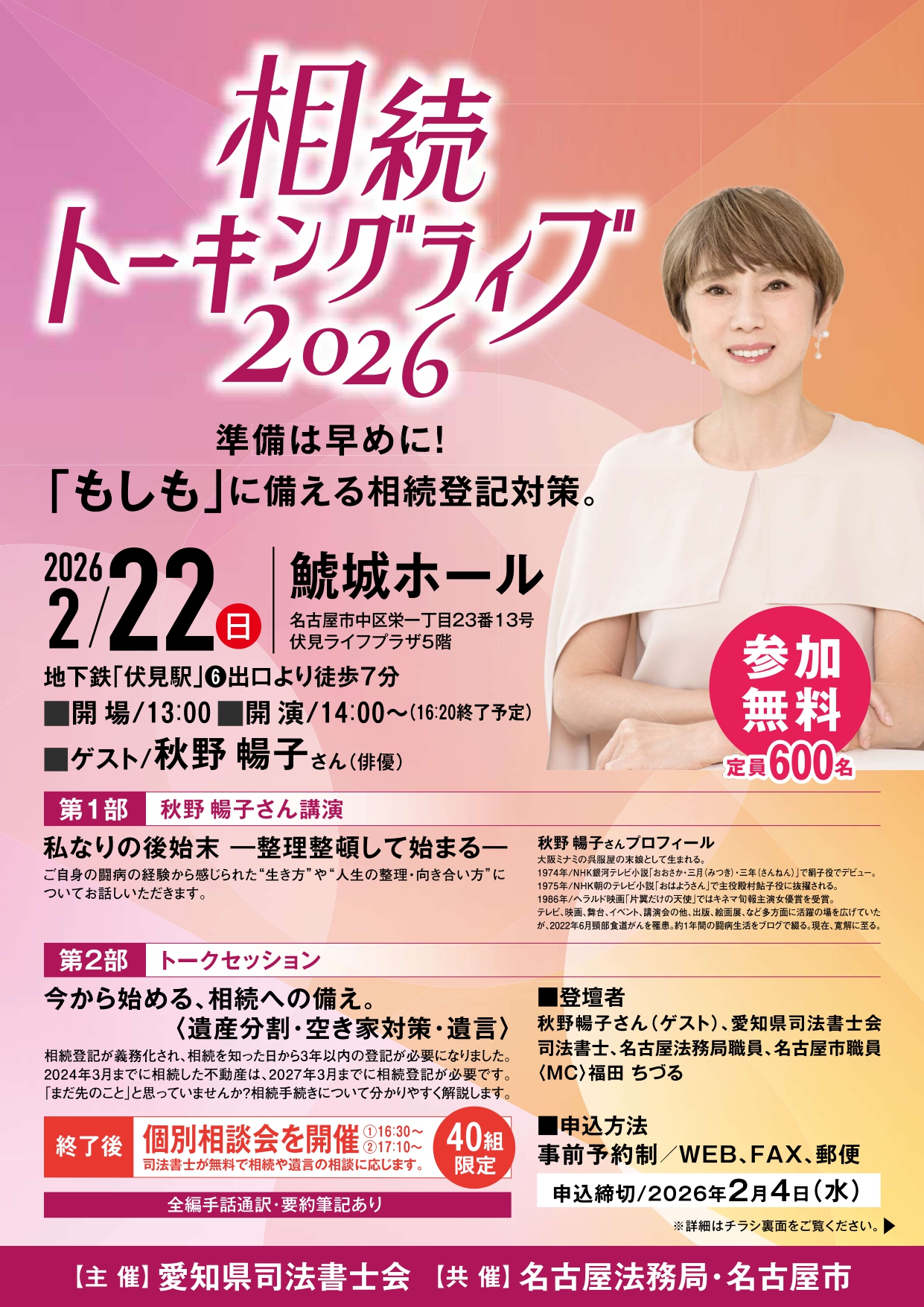ご自身の闘病の経験から感じられた“生き方”や 第2部 トークセッション 「今から始める、相続への備え。 [遺産分割・空き家対策・遺言]」 相続登記が義務化され、相続を知った日から3年以内の登記が必要になりました。2024年3月までに相続した不動産は、2027年3月までに相続登記が必要です。「まだ先のこと」と思っていませんか?相続手続について分かりやすく解説します。 登壇者 秋野暢子さん(ゲスト)、愛知県司法書士会司法書士、名古屋法務局職員、名古屋市職員 終了後 個別相談会を開催(40組限定/1組30分程度) ①16:30~②17:10~ 司法書士が無料で相続や遺言の相談に応じます。 ◎全編手話通訳・要約筆記あり |