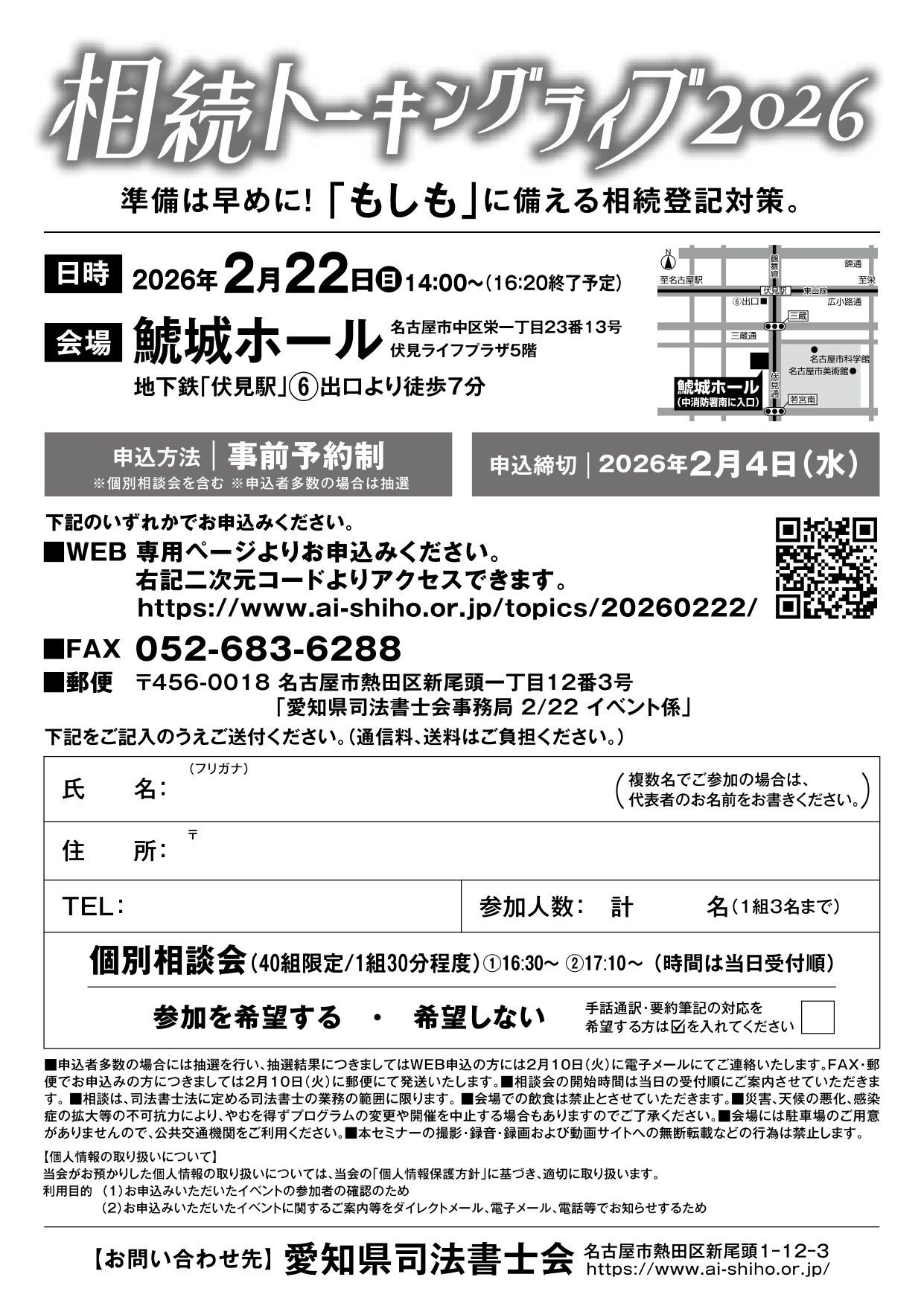 下記のいずれかでお申込みください。 WEB 下記申込フォームよりお申込みください FAX 052-683-6288 郵便 〒456-0018 名古屋市熱田区新尾頭一丁目12番3号 定員 600名 申込締切 2026年2月4日(水) |