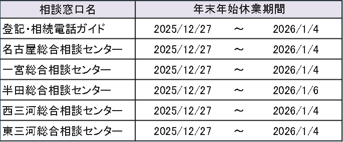 お知らせ シェア ツイート LINEで送る 2025.12.18 お知らせ 登記・相続電話ガイド、総合相談センター年末・年始の休業のお知らせ 事務局の年末・年始の休業のため、下記の期間中は電話予約をはじめ事務局対応業務をお休みさせていただきます。なお休業期間中もWEBによる相談予約をご利用いただけます。