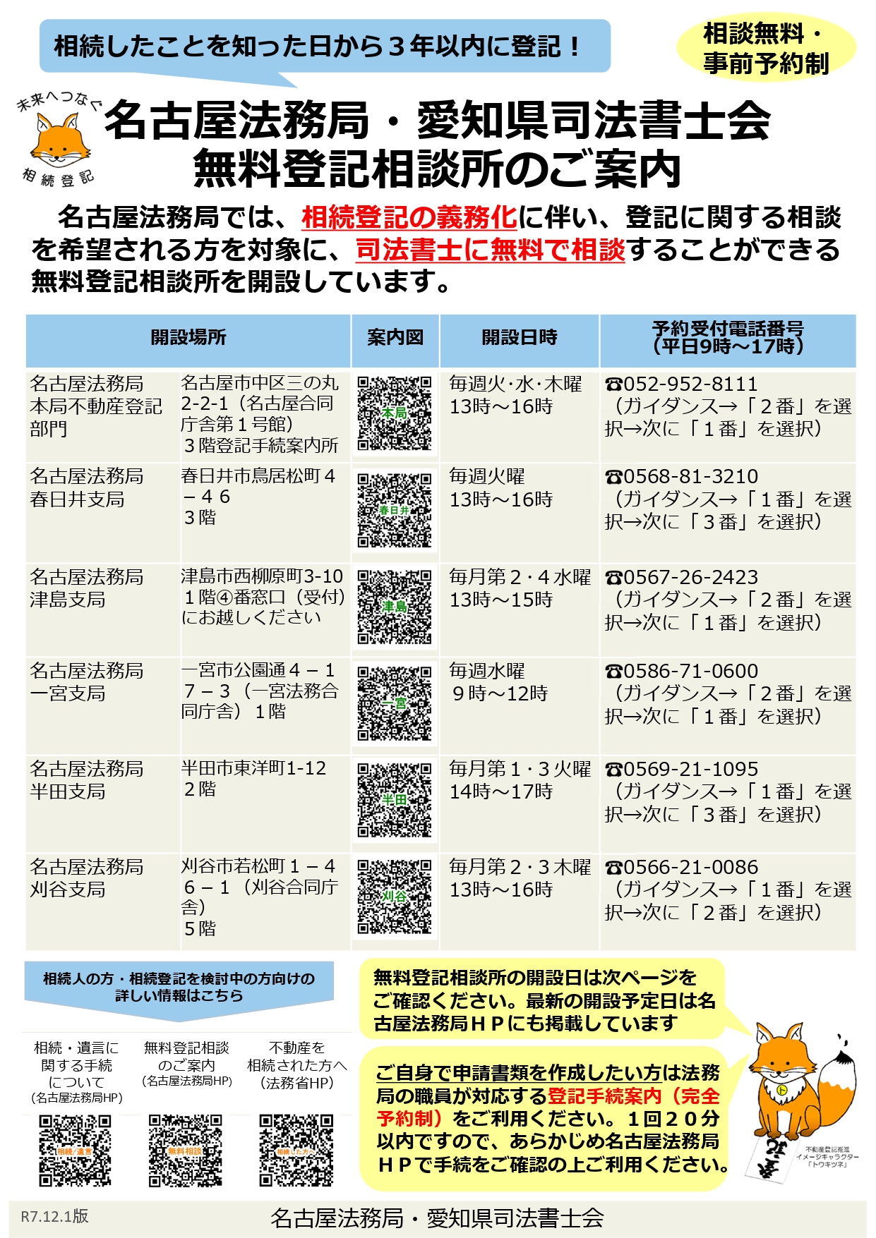 名古屋法務局および愛知県司法書士会では相続登記の申請義務化にともない、登記に関する相談を希望される方を対象に、司法書士に無料で相談することができる無料登記相談所を愛知県内6か所の法務局および支局で開設しています。