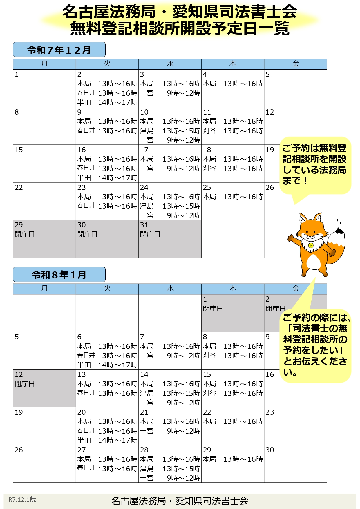 (12月・1月)「名古屋法務局・愛知県司法書士会無料登記相談所」開設予定日のご案内