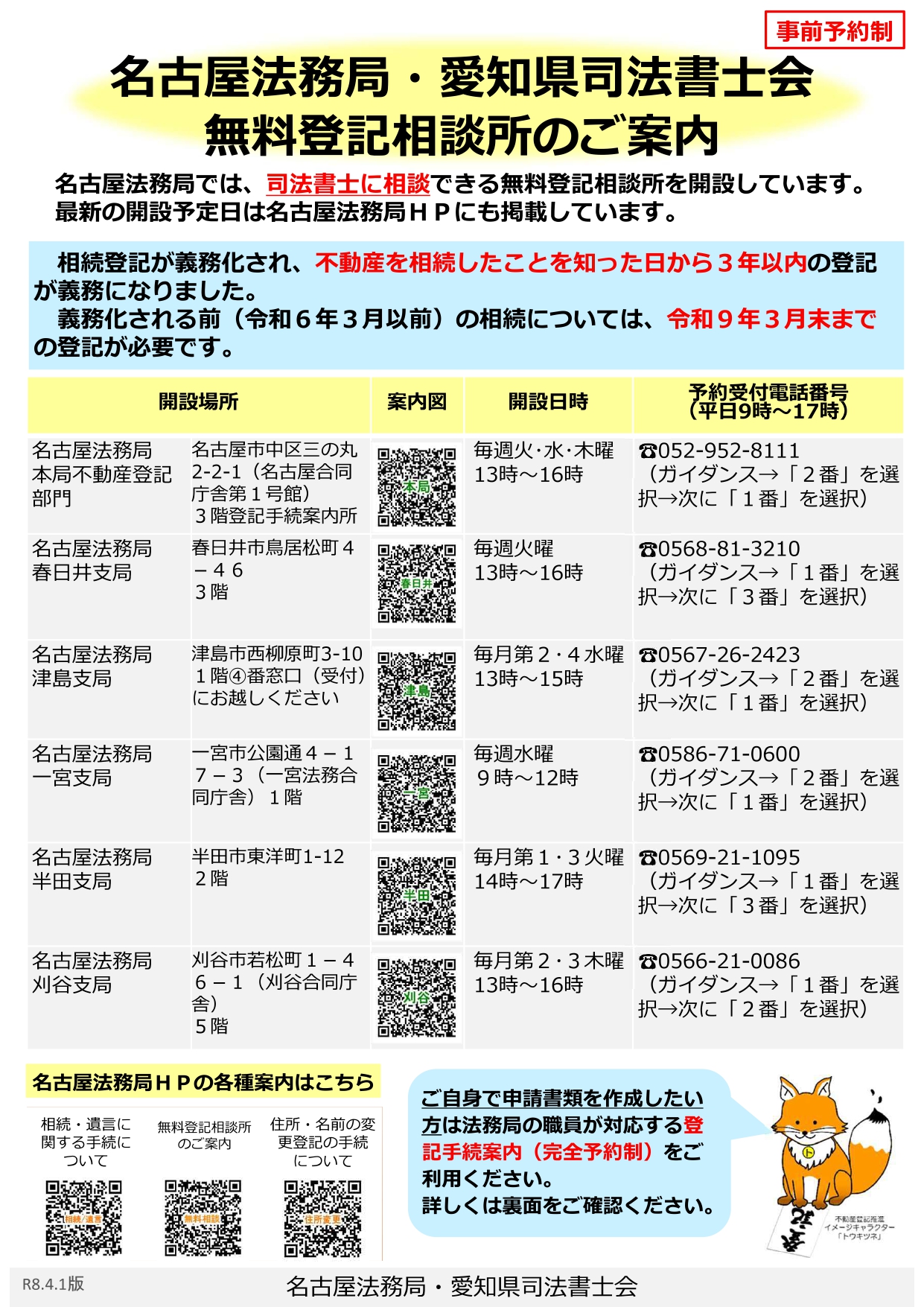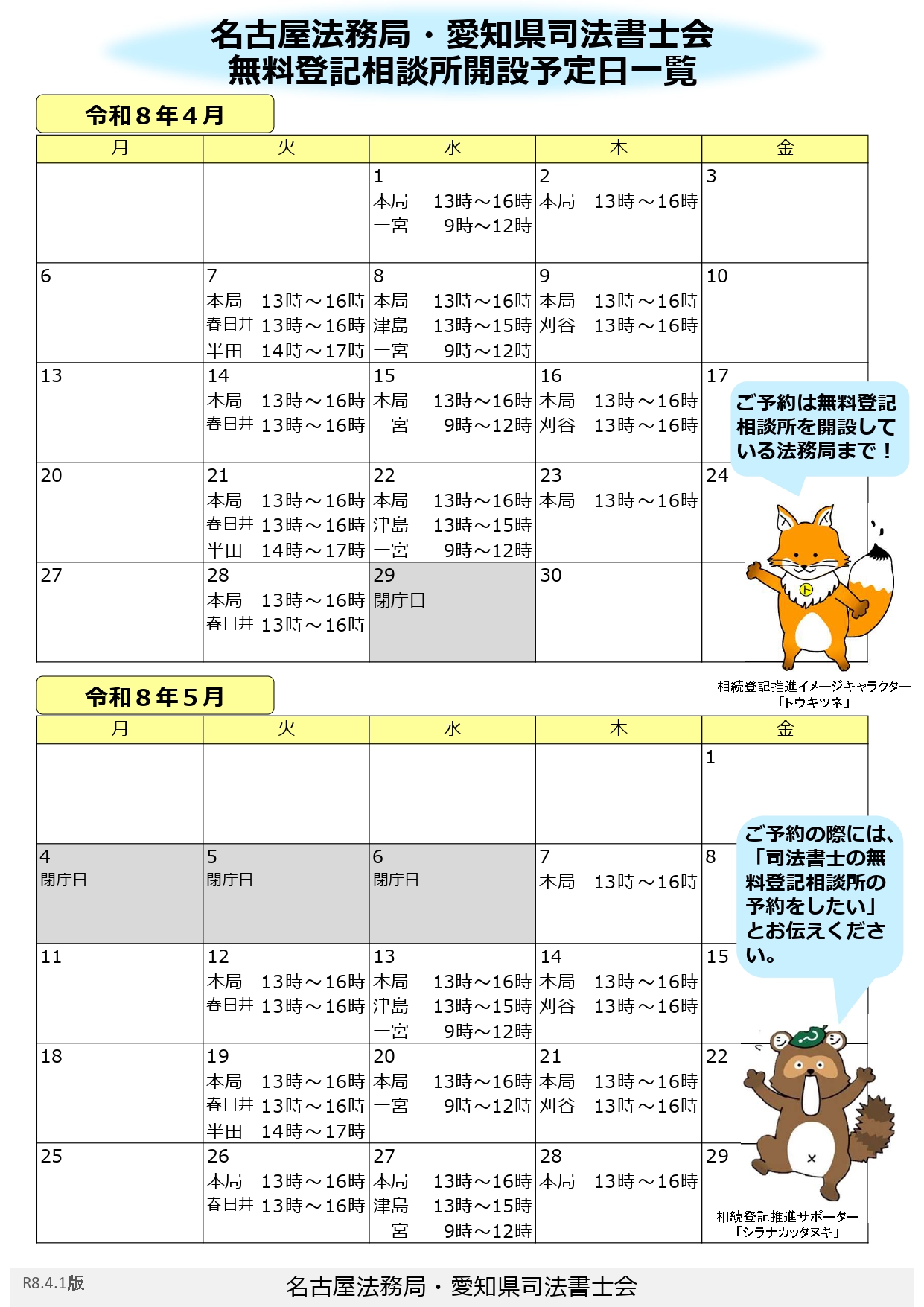 (4月・5月)「名古屋法務局・愛知県司法書士会無料登記相談所」開設予定日のご案内